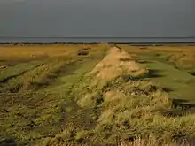 Salt marshes are the dominant landscape in the transition zone between open sea and inland. They are regularly flooded between 10 and 250 times a year depending on the tidal range. Salt marshes build different zones relative to the local salinity. The lower marsh zone which is flooded the most has a higher salinity than the upper marsh zone which is less frequently flooded because of the higher elevation. In total about 50 species of flowering plants can be found in the local salt marshes. In low elevation areas plants like common salt marsh grass (Puccinellia maritima), sea-aster (Hordeum marinum), sea-blite (Sueda maritima) and sea-purslane (Halimione portulacoides) are characteristic. High elevation areas are a lot more diverse in plant species. Common plants are seaside centaury (Centaurium littorale), red eyebright (Odontites rubra), see plantain (Plantago maritima) and distant sedge (Carex distans).[16]