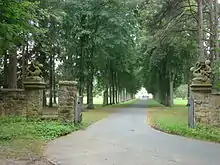 "A gateway hidden in a dense forest of tall trees and an avenue of limes lead to the very charming estate situated in a forest clearing. The drive swings around a rectangular pond with a fountain and ends in the spacious front courtyard of a in baroque-style manor house dating to 1901/02. The main building, of white painted, plastered masonry, is divided into a corps de logis centred on the main axis of the drive, a south wing to the left that is set back and half the height of the principal block, and a north wing, also set back, that is joined to the main building by a short corridor. All elements are on two levels, [... there is a] baroque-designed entrance hall with stuccoed walls; a framed ceiling mirror with stucco profiles [...] At the rear of the building is a garden room in the Classical style, with an exposed beam ceiling in the style of a Classical entablature and a similarly designed frieze of small corbel figures (Konsölchenfries) at the height of the beams. Three-dimensional ionic columns, in front of the walls and in the four corners of the room, support the beams... In the left wing is an impressive ballroom, the length of the building. Wall panelling made of almost black stained oak in the shape of fluted columns with composite capitals, […] On the surface of the stuccoed ceiling is a portrait of St. Hubert's stag in bas-relief. Against the inside wall a stove made of brown and yellow marble; with the year inscription 1926. Parquet flooring. Off the rear of this hall are two smaller rooms: left, the library with built-in bookshelves and glass wall cabinets, ceiling stucco. Right, accessible from the hall, a hall of mirrors in the shapes of the empire; […] The room is kept in white and gold with grey contouring of the details."