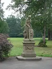 "In front of the corps de logis is a charming parterre in the baroque style. In the centre is a long, rectangular water basin with a fountain base supported by two putti.[…] Around the basin is an ambulatory, to which four steps lead on each of the two shorter sides. On the opposite side of the house is a staircase made of sandstone stringers, on each of which a life-size wild boar's head, a hunting horn, as a hunting accoutrement, and a boar spear, all on drapery, have been carved.[…] The surrounding drive is decorated with statues on pedestals to the left and right of the gateway side; on the one side is the figure of a woman with a sheaf in her arm; on the other is the goddess, Diana, with a bow, a quiver and a hunting dog by her side. To the side of forecourt are low, segment-shaped niches with benches, each flanked by two groups of putti at the ends of the wall sections. Another open staircase lined with groups of putti in front of the left-hand wing leads down to a sunken terrace."