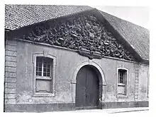 In 1713, Elector Jan Wellem had a hunting lodge, decorated with three gables from the workshop of Gabriël Grupello, built to the north of Jägerhof Palace. After the property of Schloss Jägerhof became the property of the city by purchase in 1909, the old Marstallgebäude standing at the corner of Pempelforter- and Jacobistraße (today Alt-Pempelfort) was demolished, and an orangery was built in its place.[6] The rich wood carvings, three hunting pieces, were reattached to the gables of the new building. During the Second World War, in 1943, the building, on which the carvings were permanently mounted, was completely destroyed. Parts of two gable fields could be saved and stored. The baroque main gable with the Arms of alliance and the east gable, the latter only fragmentary, densely packed with hunting scenes and hunting symbols. In 2012, the building was entered in the list of monuments as a movable monument. In 2014, the gables were taken to the Restoration Centre Düsseldorf, Ehrenhof 3a, where Alexander Diczig carried out the wood sculpting and carving work.[7]