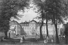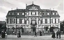 During the French occupation in 1925, the building was confiscated and used as the headquarters of the commandant's office.[3] In 1934, the consistory of the Evangelical Church in the Rhineland moved into the building. However, the existing lease was unlawfully terminated due to considerable pressure from the NSDAP Gauleiter Friedrich Karl Florian in the Gau Düsseldorf, so that on 30 January 1937 the Gauleitung could be established in the building. It sat here until the heavy air raid on 12 June 1943, during which the castle was severely damaged; it then moved to the building of the Oberlandesgericht Düsseldorf. The palace was not rebuilt until 1950 by Helmut Hentrich. Some receptions of the young Federal Republic took place here.