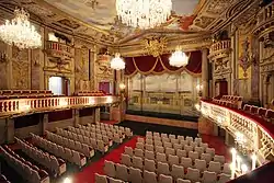 The empress, who appeared in opera and theatre, watched her children perform in tableaux vivants. The theatre first served the Habsburg court exclusively.[1] Members of the Court Opera performed at the theatre.[3] Operas by Christoph Willibald Gluck premiered there, L'arbre enchanté in 1759, and Il Parnaso confuso in 1765.[4] Joseph Haydn conducted performances of the Esterhazy orchestra in 1777.[4]