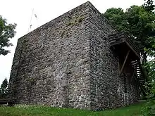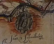 [9] Before Schmallenberg received town rights, there had been a castle of Schmallenberg which must have been destroyed around 1240. It was owned by the Archbishop of Cologne Conrad of Hochstadt and the Grafschaft Abbey. The Knight Johann Kolve had the order to protect this castle. At this time, there already must have been some kind of settlement around. The archbishop did not consider the destroyed castle as useful any more. Furthermore, the local settlement was unprotected and in a risky situation because of the castle. That is why the archbishop and the Grafschaft Abbey wanted to fortify the place, leaving the old castle outside the town wall.