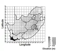 Schoenus compar mostly occurs in southwestern South Africa, although it reaches Humansdorp in the East and the Cederberg mountains in the north.[1] It is a species that grows on coarser growing substrates (e.g. sand or rocks) at lower elevations (20 m to over 800 m) than other Southern African Schoenus species.[1] This species mostly grows on dry sites among fynbos vegetation.[1]