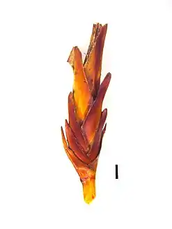 This species is one of the more conspicuous Southern African Schoenus species.[1] Key diagnostic characters include papery, ivory leaf sheaths, as well as compact and thick inflorescences.[1] The spikelet glumes are relatively firm and viscous, and range in colour from gold when young to reddish-brown when mature.[1] Part of the plant is viscous, especially the culm bases and inflorescences.[1]