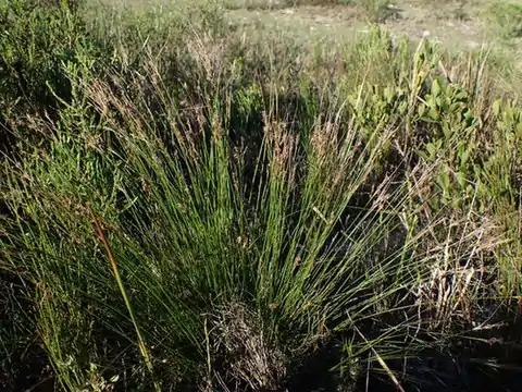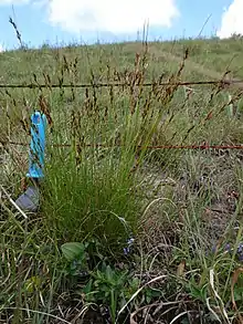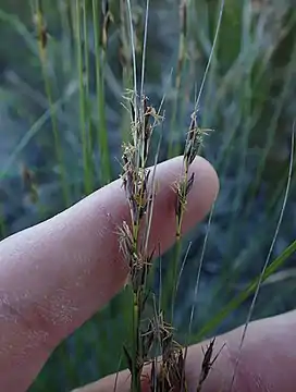 A species that could be confused with S. graciliculmis is Schoenus galpinii, since the distributions of these two species overlap around the Amathole Mountains in the Eastern Cape Province.[1] Spikelet form differentiates these two species, as the spikelets of S. graciliculmis are aristate in shape, whereas those of S. galpinii are cuspidate.[1] Furthermore, the growth form of S. galpinii tends to be more robust compared to S. graciliculmis, with leaves that are usually less than half the length of the culms.[1]