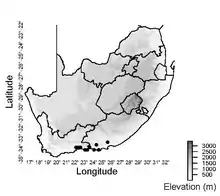 The recorded distribution of Schoenus schonlandii ranges from the Zuurberg area in the east to the George area in the west, generally near the southern coast of South Africa.[1] Collections of this species have been made from dry slopes, ridges and bushy places from elevations near 100 m to nearly 1700.[1]