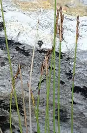 Schoenus submarginalis is a species in family Cyperaceae, tribe Schoeneae.[1] Other notable genera in tribe Schoeneae include Lepidosperma, Oreobolus, Costularia, Tetraria and Gahnia.[1][3][4] The most closely related species to S. submarginalis are other southern African Schoenus species, specifically, species in the S. cuspidatus and allies group.[1]