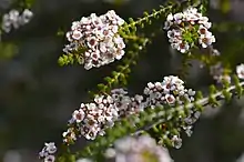 The erect, spreading to decumbent shrub typically grows to a height of 0.2 to 1.5 metres (0.7 to 4.9 ft).[1] The evergreen leaves are 4 to 9 millimetres (0.157 to 0.354 in) in length.[2] It blooms between November and May producing pink-white flowers.[1] Each flower has a diameter of 8 mm (0.315 in).[2]