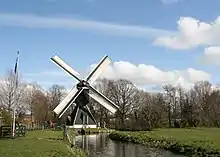It is situated quite close to the Huis ter Cleeff and was witness to the inquartering of the Spaniards under the Duke of Alva, which explains why the small canal next to it was called the Spanse-vaart and further towards the river Spaarne a street situated along the former route of the canal is called Spaansevaartstraat.[2] Inspection in the 1950s brought to light some carpenters' marks in the foundations that go back to the 16th-century and as wipmolen De Stoop it was possibly built by the Spaniard troops during the siege of Haarlem.[4]
