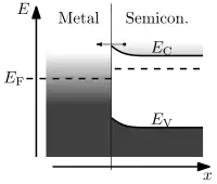 When a metal is put in direct contact with a semiconductor, a so called Schottky barrier can be formed, leading to a rectifying behavior of the electrical contact. This happens both when the semiconductor is n-type and its work function is smaller than the work function of the metal, and when the semiconductor is p-type and the opposite relation between work functions holds.[3]