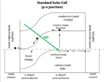 The Schottky-junction is an attempt to increase the efficiency of solar cells by introducing an impurity energy level in the band gap. This impurity can absorb more lower energy photons, which improves the power conversion efficiency of the cell.[6] This type of solar cell allows enhanced light trapping and faster carrier transport compared to more conventional photovoltaic cells.[7]
