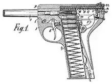 The Schouboe pistol was originally designed in 1903 as a pocket pistol chambered in 32 ACP.[1] In 1907, Schouboe developed a 45 caliber version of the pistol for entry in the 1907 US pistol trials. The trials requirements included the pistol being 45 caliber. The Schouboe was direct blowback, so it could not handle the energy of a traditional 45 caliber cartridge. To get around this, Schouboe made the bullets have a wood core with a metal jacket so that the bullet would be light enough that it could be fired out of the pistol and the pistol would eject safely. The pistol was rejected for not having sufficient wounding ability.[2]