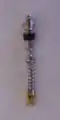 A Schrader valve consists of an externally threaded hollow cylindrical metal tube, typically of nickel plated brass. In the center of the exterior end is a metal pin pointing along the axis of the valve stem; the pin's end is approximately flush with the end of the valve body.