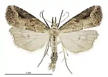 The wingspan is 16–22 mm. The length of the forewings is 9–11 mm. Forewing whitish ochreous, mixed with brownish fuscous towards costa; a fine black dash beneath costa at base; inner line partly blackish, dentate; outer oblique, irregular, partly marked with dark and edged posteriorly with whitish; cellspot small, blackish, connected with outer line by dark fuscous suffusion; subterminal line indistinct, pale; hindwing luteous whitish, with a grey discal dot.[1]
