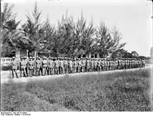 A pre-war company consisted of 160 (expandable to 200) men in three platoons (Züge) of 50 to 60 men each, including two machine-gun teams. Each of the 14 companies also had a minimum 250 man carrier contingent as well as native irregulars known as Ruga-Ruga, called Fita-Fita in German Samoa, of approximately the same size units.[3]