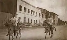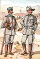 African personnel wore a pocketless cotton khaki tunic and breeches with blue puttees and ankle boots, which replaced bare lower legs and feet. African personnel also wore a red fez over which a khaki cover could be worn in the field. Company numbers were often worn on the front of the fez. In field conditions the askari wore either a khaki cover over their red fez or a khaki tarbush consisting os a khaki cloth over a wicker frame. Later in the war African troops wore a large floppy hat en lieu of the fez.[12] The arm of service color for African/native troops was red so their uniforms, when trimmed, were trimmed red down the trousers seam, the tunic fly, collar edge, plus NCO's wore red, later brown, chevrons on the left sleeve only.[13]