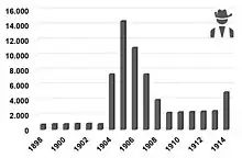 The Schutztruppe in German Southwest Africa was structured in 12 companies of mounted infantry totalling ca. 2,000 men in July 1914, primarily Germans.[3] The 7th Company, stationed in the northern desert area of the colony, was mounted on imported camels. A single unit, called the Baster Company of non-local Africans was raised and deployed. Relations between the German administration and the natives in this colony had deteriorated to the point that few local Africans were recruited; however, Boers and Afrikaners did join to renew their fight against Great Britain.