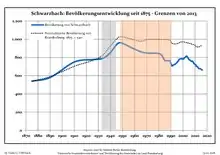 Development of Population since 1875 within the Current Boundaries (Blue Line: Population; Dotted Line: Comparison to Population Development of Brandenburg state; Grey Background: Time of Nazi rule; Red Background: Time of Communist rule)