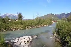 ![]() Mouth of the Schwarzlofer (from bottom right) into the Großache (from bottom left to top right), in the background the Kaiser Mountains | |