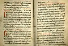 "Octoechos" printed in the format in folio, made in the technique of two-color printing, and is made up of twenty two[18] 8-sheet notebooks. The last 3 sheets are blank, with 172 total pages. Some of the pages are decorated with complex patterns, in the beginning of each chapter, capital letters are painted with vermilion, decorated with a modest ornament. On the second page of the book before the start of the text displayed under a braided headband is a braided initial. In addition, incunabula contains 12 lines and simple tie in drawing, small in terms of size, the initials of pawn shops.[19]