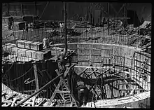 In 1941, construction for the Schwerbelastungskörper began for the purpose of testing the load-bearing capacity of the ground on the planned site of Hitler's Triumphal Arch.[7] The Triumphal Arch was to be Hitler's focal point of Germania, therefore the Schwerbelastungskörper was a vital and necessary piece of construction.[1] The Schwerbelastungskörper was constructed by the French prisoners of war in forced labor camps. If it were to sink less than 6 cm (2.4 in), the soil would be deemed sound enough for further construction without additional stabilization. An analysis of the meticulous measurements only took place in 1948, revealing that the cylinder had sunk some 19 cm (7.5 in) after two and a half years. The arch as conceived by Speer could only have been built after considerable prior stabilization of the ground.