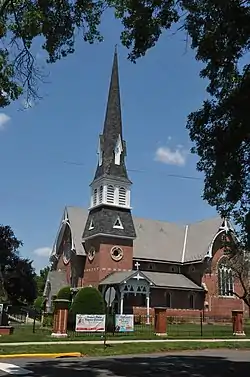 The present church is located in an American Revolutionary War-era cemetery known as "God’s Little Acre", with Watchung Mountains-quarried brown sandstone grave markers dating back to 1742.[1] The original church dated from the early 18th century. After a fire, it was rebuilt around 1816.[1] The present church was built in 1871 in a Gingerbread Ruskinian Gothic style “made of pressed brick with Ohio stone and white brick trimmings.”[1]