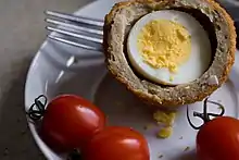Other claims include the name coming from a nickname used by Londoners who lived around Wellington Barracks after Officers of the Scots Guards stationed there, and who developed a taste for the snack.[3] According to Culinary Delights of Yorkshire, they originated in Whitby, Yorkshire, England, in the 19th century, and were originally covered in fish paste rather than sausage meat. They were supposedly named after William J. Scott & Sons, a well-known eatery which sold them.[4] However, the date does not fit with the known use of the term at least 75 years earlier. It has also been suggested that they were originally called "scorch" eggs, as they were cooked over an open flame, though according to surviving recipes they were deep-fried in lard. 'Scotching' as a culinary process is also sometimes cited as the origin, though what 'scotching' was is open to interpretation, from the inclusion of anchovies to simply mincing meat.[5] Further confusion is added by the large trade in eggs from Scotland in the 19th century, which sometimes involved dipping eggs in a lime powder, a process possibly also known as 'scotching'.[6]