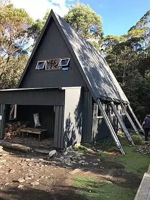 The hut was financed by a public appeal, which raised $3,000.[12] It was built by Riverside High School and Launceston Walking Club with help from other organisations, such as the North West Walking Club. Plans were drawn up by architect Arnold Rowlands, a member of the North West Walking Club whose wife Mavis was a cousin of Scott. The plan was approved by the Scenic Preservation Board, and work began at the Lake Rodway site in September 1965, under the cliffs of the southern face of Cradle Mountain. The Board had wanted a hut on Lake Rodway for some time, but had been unable to finance it.[13]