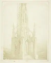 The foundation stone was laid on 15 August 1840 by Sir James Forrest of Comiston in his capacity as Lord Provost and as Grand Master Mason of Scotland.[8] Construction began in 1841 following permission by Parliament's Monument to Sir Walter Scott Act and ran for nearly four years. It was completed in the autumn of 1844, with Kemp's son placing the finial in August of the year. The total cost was just over £16,154.[9] The monument was inaugurated on 15 August 1846, but George Meikle Kemp was absent. He had fallen into the Union Canal while walking home from the site and drowned on the foggy evening of 6 March 1844.