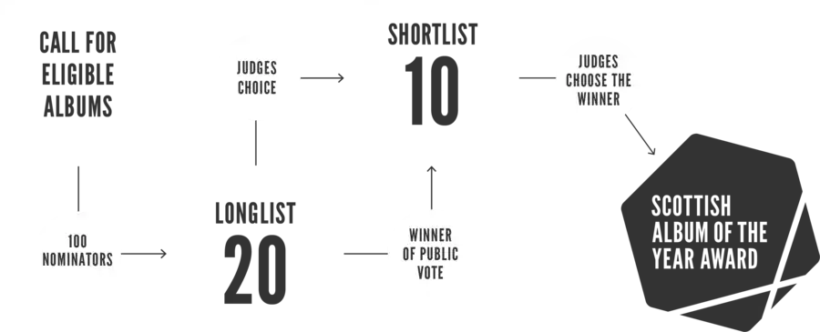 The Longlist is then whittled down to a Shortlist of 10 albums, one of which will be chosen by music fans via an online public vote and the others decided by The SAY Award judging panel. Previous judges have included the composer Craig Armstrong, Turner Prize winning artists Douglas Gordon and Susan Philipsz, Filmmaker Lynne Ramsey, Music Editor of The Skinny Tallah Brash, DJ and Promoter Sarra Wild, Edinburgh International Festival Director Fergus Linehan, Sub Club Partner/Director Barry Price and Scottish Ballet's Sophie Laplane.