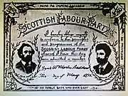 R B Cunninghame Graham, a strong supporter of Scottish independence, was the party's main MP, for the North West Lanarkshire constituency, between his defection from the Liberal Party in 1888 and his defeat in the United Kingdom general election 1892, in the Glasgow Camlachie constituency. Two other MPs, Gavin Clark and Charles Conybeare, held honorary offices in the party until January 1893.[4] Following their departure, with many of the other radicals, the party declared itself in favour of socialism, and prohibited officials (but not other members) from dual membership with other political parties.[5] The party ran two other candidates in 1892: J. Bennett Burleigh in Glasgow Tradeston and James MacDonald in Dundee. Attempts by Cunninghame Graham and Shaw Maxwell to arrange a non-contest pact with the Liberals failed, and the SLP candidates did not poll well.[6]