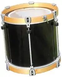 The Scottish tenor drum is a musical instrument used within Scottish pipe bands. It is a double-headed membranophone that is held vertically with one head up, one head down, and played with soft mallets on the top head only. Common sizes of drums are 15, 16, 18, or 20 inch in diameter, with 12, 14, or 16 inch depth. The playing style of the Scottish tenor drum has varied throughout the years, but there is typically a variation of the combination of swings (or flourishes) and rhythmic accompaniment to the Scottish snare drum and the Great Highland Bagpipes. It is similar to the more common marching band style tenor drum.