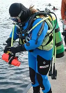 A backplate and wing is an alternative configuration of scuba harness with a buoyancy compensation bladder known as a "wing" mounted behind the diver, sandwiched between the backplate and the cylinder or cylinders. Unlike stabilizer jackets, the backplate and wing is a modular system, in that it consists of separable components. This arrangement became popular with cave divers making long or deep dives, who needed to carry several extra cylinders, as it clears the front and sides of the diver for other equipment to be attached in the region where it is easily accessible. This additional equipment is usually suspended from the harness or carried in pockets on the exposure suit.[29][30] Sidemount is a scuba diving equipment configuration which has basic scuba sets, each comprising a single cylinder with a dedicated regulator and pressure gauge, mounted alongside the diver, clipped to the harness below the shoulders and along the hips, instead of on the back of the diver. It originated as a configuration for advanced cave diving, as it facilitates penetration of tight sections of cave as, sets can be easily removed and remounted when necessary. The configuration allows easy access to cylinder valves, and provides easy and reliable gas redundancy. These benefits for operating in confined spaces were also recognized by divers who made wreck diving penetrations. Sidemount diving has grown in popularity within the technical diving community for general decompression diving,[31] and has become a popular specialty for recreational diving.[32][33][34]