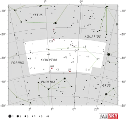 Sculptor is a small constellation bordered by Aquarius and Cetus to the north, Fornax to the east, Phoenix to the south, Grus to the southwest, and Piscis Austrinus to the west. The bright star Fomalhaut is nearby.[6] The three-letter abbreviation for the constellation, as adopted by the International Astronomical Union in 1922, is "Scl".[7] The official constellation boundaries, as set by Belgian astronomer Eugène Delporte in 1930,[lower-alpha 2] are defined by a polygon of 6 segments. In the equatorial coordinate system, the right ascension coordinates of these borders lie between 23h 06.4m and 01h 45.5m , while the declination coordinates are between −24.80° and −39.37°.[9] The whole constellation is visible to observers south of latitude 50°N.[lower-alpha 3]