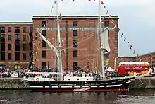 She is rigged as a 34m brig,[11] with a sail area of 536 square metres (641 sq yd). Her draught is 3.25 metres (10 ft 8 in).[12] The ship's hull is of high tensile steel, with her superstructure of glass reinforced plastic. She has a crew of eight, plus up to twenty-four Cadets and two adult trainees. Twelve passengers can also be carried.[13]