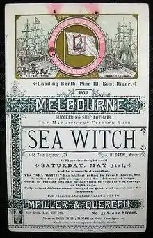 Sea Witch was 192 feet in length, had a 43-foot beam, and was of 908 tons burthen.[2] She was designed and built by the shipbuilding firm of Smith & Dimon in New York City as a purpose-built vessel for the speedy movement of high-value freight, such as porcelain and tea, from China to the United States East Coast. To this end, she was very heavily sparred and built with especially tall masts for a vessel of her size. Her 140-foot mainmast carried five tiers of sails, as did the shorter foremast and mizzenmast. She was briefly the tallest ship afloat, and is credited with being one of the first American "clipper ships."[2][5]