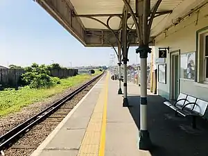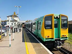 Seaford railway station is in Seaford, East Sussex, England. It is the terminus of the Seaford branch line of the East Coastway line, 58 miles 77 chains (94.9 km) measured from London Bridge.[1] The line to the station has been reduced to a single track and only one platform remains in use (previously two), though it is still numbered "platform 2". Platform 1 is still visible but the track has been removed.