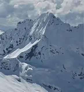 Connected to the main peak by the roughly 7,000-foot (2,100 m)-high Jagged Ridge, Seahpo Peak stands to the north at the headwaters of a headstream of Sulphide Creek, a tributary of the Baker River. Several waterfalls tumble off its flanks,[3] including Seahpo Peak Falls and Cloudcap Falls. (Seahpo Peak is sometimes referred to as Cloudcap Peak.[1]) The mountain is also on the south side of the Nooksack Cirque, which forms the headwaters of the Nooksack River. It is bordered by the East Nooksack Glacier to the north and a few smaller unnamed glaciers to the south. It is also connected to Icy Peak by another unnamed ridge.[4]