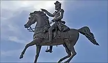 The Seal of the Confederate States prominently features the Statue of Washington in the capital square at Richmond.[1] In the seal, Washington is surrounded with a wreath made of some of the main agricultural products of the Confederacy: wheat, corn, tobacco, cotton, rice and sugar cane. The top margin features the words 'The Confederate States of America: 22 February 1862'. This date reflects the establishment of the federal government under the new Confederate Constitution when Jefferson Davis was inaugurated as the President of the Confederate States on Washington's birthday (February 22), 1862, in the capital square at Richmond, then the nation's capitol.[3] The bottom margin contains the national motto, Deo vindice, meaning '(With) God (as) our defender/protector'.[lower-alpha 1] C.S. Senator Thomas Semmes, in proposing the motto, took pains to stress that both the provisional and the permanent Confederate constitution "had deviated in the most emphatic manner from the spirit that presided over the construction of the Constitution of the United States, which is silent on the subject of the Deity."[4] The religious motto reflected the view of, probably, most Confederate citizens: that slavery was condoned by Christianity and thus, by extension, the Confederacy was supported by God.[5]