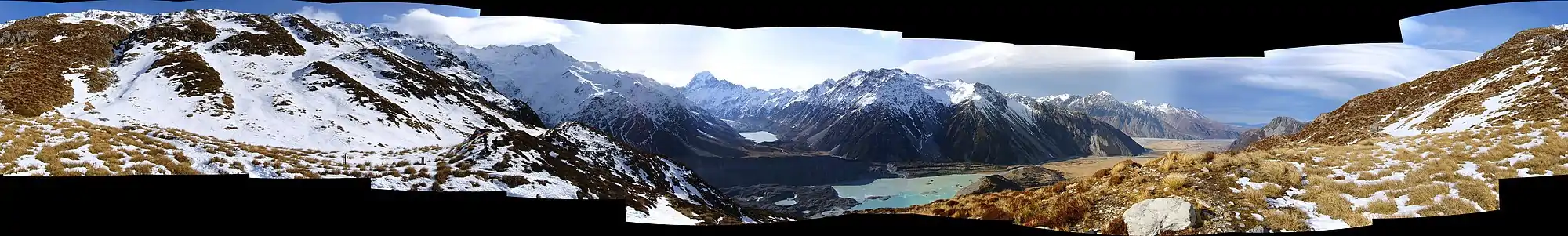The Sealy Tarns area marks the end of the well-maintained track, with a popular tramping route that continues to climb to Mueller Hut.[1] The area features two small tarns (hence its name), an area suitable for tobogganing on the side of the ridge, and an excellent view of The Footstool, Aoraki / Mount Cook, both Hooker and Mueller Glaciers and their respective proglacial lakes, and Mount Cook Village.