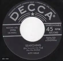 "Searching (For Someone Like You)" is a song written by Pee Wee Maddux, sung by Kitty Wells, and released on the Decca label (catalog no. 9-29956). In July 1956, it peaked at No. 3 on Billboard's country and western juke box chart.[1] It spent 34 weeks on the charts and was also ranked No. 5 on Billboard's 1956 year-end country and western retail best seller chart and No. 9 on the year-end juke box chart.[1][2]
