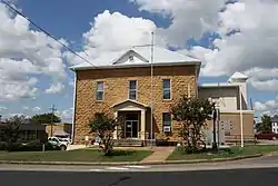 The Searcy County Courthouse is located on Courthouse Square in Marshall, Arkansas. It is a two-story stone structure, with a hip roof. The walls are fashioned out of rustically cut native sandstone, and it is topped by a metal hip roof with widely overhanging eaves. The front entrance is sheltered by a single-story porch supported by cast stone columns. The courthouse, the third for Searcy since its incorporation in 1838, was built in 1889 on the site of the second courthouse, which was destroyed by fire. The first courthouse was in Lebanon, about 6 miles (9.7 km) to the west, before being moved to Marshall in 1855.[2]