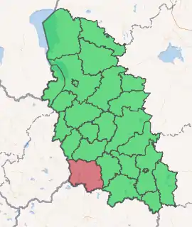 Sebezhsky District (Russian: Се́бежский райо́н) is an administrative[1] and municipal[2] district (raion), one of the twenty-four in Pskov Oblast, Russia. It is located in the southwest of the oblast and borders with Rasony and Verkhnyadzvinsk Districts of Vitebsk Oblast of Belarus in the south, Zilupe, Ludza, and Cibla municipalities of Latvia in the west, Krasnogorodsky and Opochetsky Districts in the north, and with Pustoshkinsky and Nevelsky Districts in the east. The area of the district is 3,100 square kilometers (1,200 sq mi).[3] Its administrative center is the town of Sebezh.[2] Population: 21,674 (2010 Census);[4] 25,473 (2002 Census);[8] 26,926 (1989 Census).[9] The population of Sebezh accounts for 29.4% of the district's total population.[4]