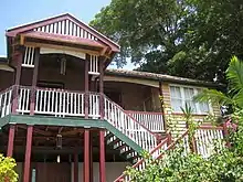 The architectural elements of the building combine grand scale "Queenslander" features and traditional court house architecture. While there are limited associations with government or justice in its current location, the building has become an important element of the streetscape of Buckley Street, overlooking the Yorkeys Knob Marina and Boat Club. Aesthetic features that can be appreciated from the street include the dominant use of timber as a construction material, pyramid shaped corrugated iron roof and the elaborate ventilation fleche and casing of the court room, pattern of 4 panel sash windows and vertically framed frenchlights, encircling verandahs, symmetrical double-elbow shaped front stairs, verandah entrance highlighted as a frontispiece by paired posts and gable pediment, slat balustrading, high set frame, large scale and its siting above street level.[1]