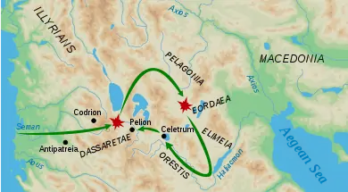 At the end of winter in 200 BC, Sulpicius led his troops east through the territory of the Dassaretae. Philip gathered 20,000 infantry and 4,000 cavalry, recalling the troops he had stationed in the north with Perseus, and marched west. He encamped on a hill near Athacus which overlooked Sulpicius' camp. After a series of indecisive skirmishes (in one of which Philip was nearly captured), news came that the Dardanians had invaded northern Macedonia, and the Macedonians withdrew secretly in the night.[14] When he realised what had happened, Sulpicius set out in pursuit through Pelagonia, found Philip blocking the pass to Eordaea and forced it. Sulpicius ravaged Eordaea, then Elimeia to the south, and then followed the Haliacmon river valley up to Orestis, where he conquered Celetrum and Pelion and then returned to his base.[15] Philip split his force, sending a contingent of his army north to deal with the Dardanian invasion, which it did, while he himself headed south.