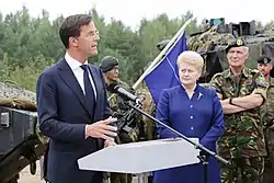 On 4 October 2017 Minister of Defence Jeanine Hennis-Plasschaert (VVD) resigned following a critical report by the Dutch Safety Board into the investigation of the accidental deaths of two Army soldiers who died following the use of old ammunition during a Mortar test during the United Nations Multidimensional Integrated Stabilization Mission in Mali.[7] She was replaced as Minister of Defence by State Secretary for Security and Justice Klaas Dijkhoff (VVD) who served out the remaining three weeks before the installation of the new cabinet.[8]