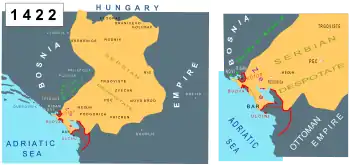 Lazarević and his Serbian Despotate had been ceded Lordship of Zeta from Balša III in April 1421, but the Venetians did not recognize him, holding on to the occupied Zetan coast and Bojana, including Drivast recaptured by them after Balša's death.[6] Venetians emphasized to the despot's envoy that they had no intention to cede Balša's former possessions to the despot and even requested Ottoman support in case of the despot's attack.[7] In August 1421, Lazarević led his army into Zeta. Gjon Kastrioti, who was a Serbian ally,[8] reinforced Lazarević with troops led by one of his sons immediately upon the arrival of the latter in Zeta.[9][10] According to Fan Noli it was Stanisha who was sent by his father, together with auxiliary forces, to help the Serbian despot to capture Scutari from the Venetians.[11] With their support, the despot immediately captured Sveti Srdj and Drivast. Then he went to the coast and took Bar in the middle of November 1421.