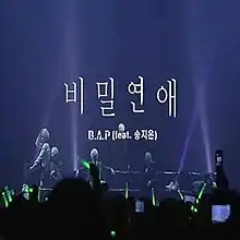 "Secret Love" is a promotional single from B.A.P's first mini-album, Warrior (EP). "Secret Love" is a R&B, Hip-Hop song with influences from Latin. The song runs for 3:27 (3 minutes, 27 seconds). It was written by Bang Yong Guk and Kang Jiwon; and produced by Kang Jiwon and LOPTOMIST.[2] The song features the vocals of label mate Song Jieun of Secret, taking the lyrics of the female part.[2] The song lyrically tells the sad love story from the perspective of a celebrity and how they have to hold secret relationships.[1][2]
