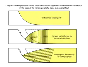 This mechanism deforms an element to accommodate a change in shape by movement on closely spaced parallel planes of slip. The commonest assumption is vertical shear although comparisons with well understood examples suggest that antithetic inclined shear (i.e. in the opposite sense of dip to the controlling fault) at about 60°70° is the best approximation to the behaviour of real rocks under extension.[5][6] These algorithms preserve area but do not, in general, preserve line length. Restoration using this type of algorithm can be carried out by hand, but is normally done using specialist software. This algorithm is not generally thought to represent the actual mechanism by which deformation occurs, just to represent a reasonable approximation.